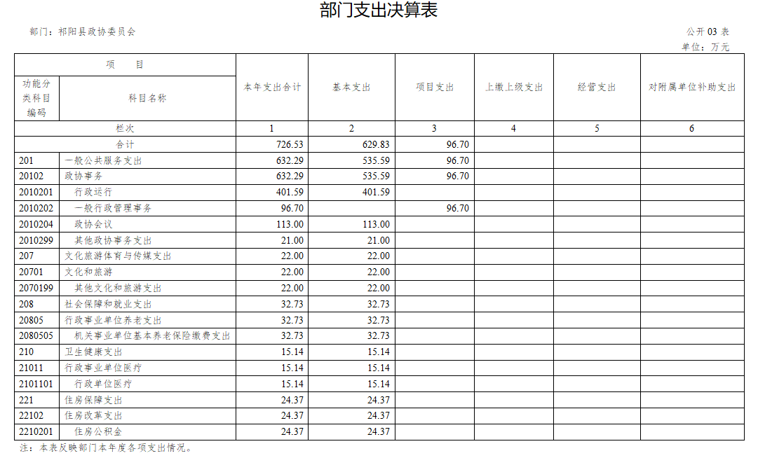2020年,祁阳县政协本级总收入为726.53万元,其中财政拨款为726.53万元。总支出为726.53万元,其中基本支出为629.83万元,项目支出为96.7万元。基本支出核算的主要内容是人员工资、社会保障缴费、机关正常运转、完成日常工作任务发生的商品和服务支出等。项目支出核算主要用于政协常委考察 、政协委员活动、政协例会、省市政协委员、提案建议、民族团结进步创建、社情民意及调研、关注生态环境保护、政协云平台维护、政协信访室接、政协会议及表彰等。