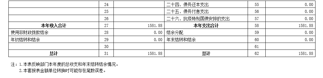 2023年度收、支总计1581.88万元。与上年相比,减少11.92万元,减少0.75%,主要是因为政府性基金预算财政拨款收入减少。