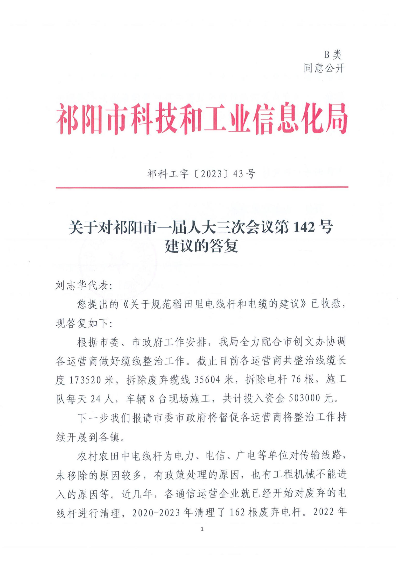 祁科工字〔2023〕43号 关于对kaiyun体育全站网页登录一届人大三次会议第142号建议的答复