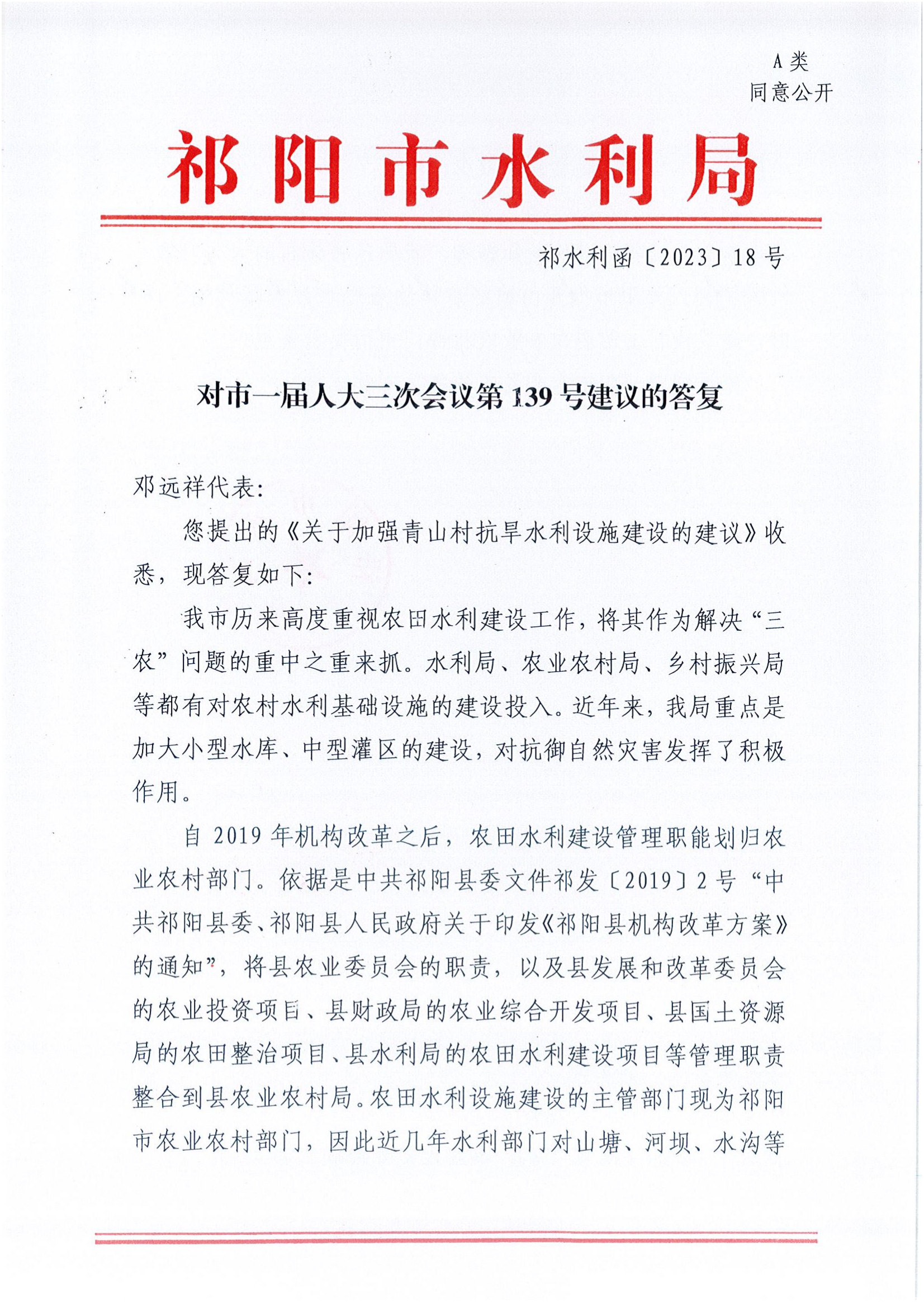 祁水利函〔2023〕18号 对市一届人大三次会议第139号建议的答复